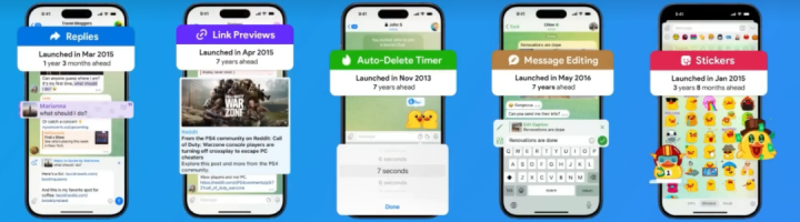 之前的坊间流传,微信有很多产品经理都会私下使用Telegram,借鉴他们的创新设计,包括WhatsApp、Instragram、Facebook等等。